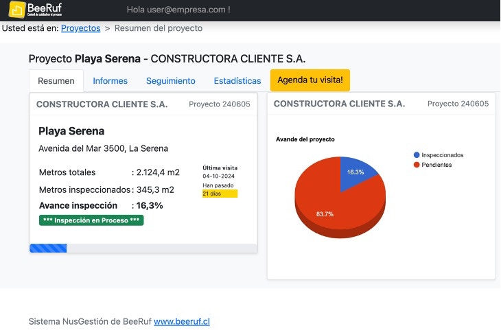 APOLO es una plataforma web que permite concentrar los informes de inspección, seguimiento de las áreas impermeabilizadas y mostrar estadísticas del área como número de problemas que se tienen dependiendo del tipo de impermeabilización. La base del sistema es una inspección física de las áreas comunes mediante una prueba de estanqueidad eléctrica que se realiza con dos tipos de equipos electrónicos desarrollados por BeeRuf.